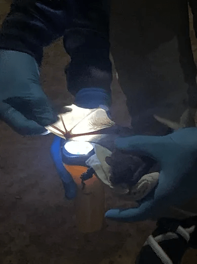 Scientists showing off bat they just caught