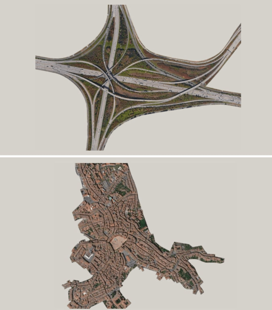 On top, a section of a highway in Houston, below, Siena, Italy (Source Unknown).